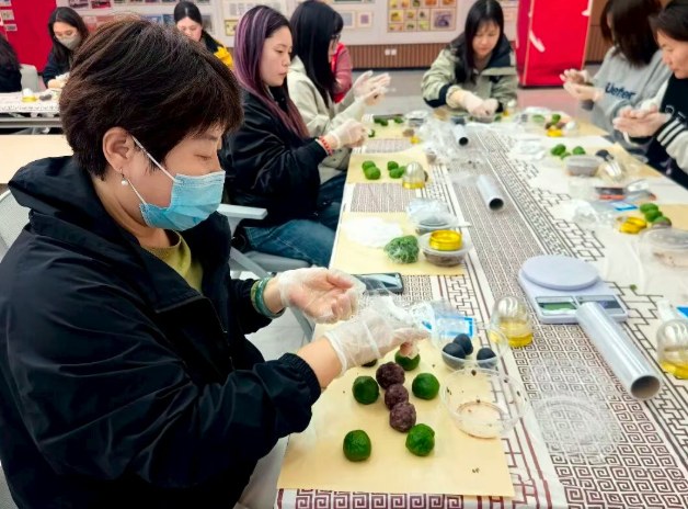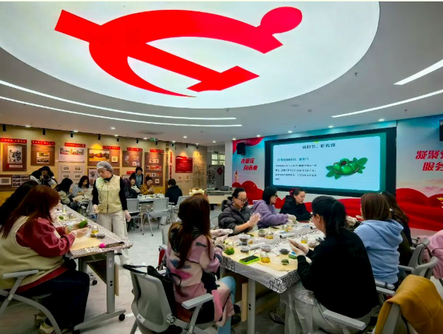 分享结束后,进入青团创意制作环节,工作人员现场讲解青团的制作工艺和清明食俗的文化内涵,居民们分工协作、动手实践,揉面、包馅、塑形。
